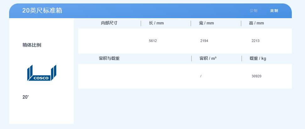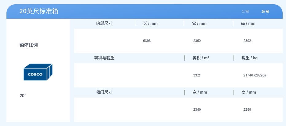 20英尺集裝箱,體積是2.3米寬,2.3米高,6米長(zhǎng),最大貨物重量約28噸;