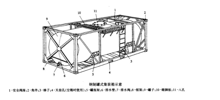 罐體四周有起保護(hù)和吊裝作用的角部承力框架。罐箱的外部框架尺寸完全等同于國(guó)際標(biāo)準(zhǔn)20集裝箱的尺寸(長(zhǎng)20英尺,寬:8英尺,高:8英尺/6英寸)。